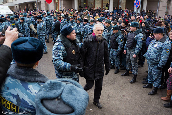 Le professeur Victor Vasilyev arrêté par la police russe lors d’une manifestation publique, février 2014. Crédit photo : Mikhail Kirosirov